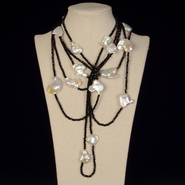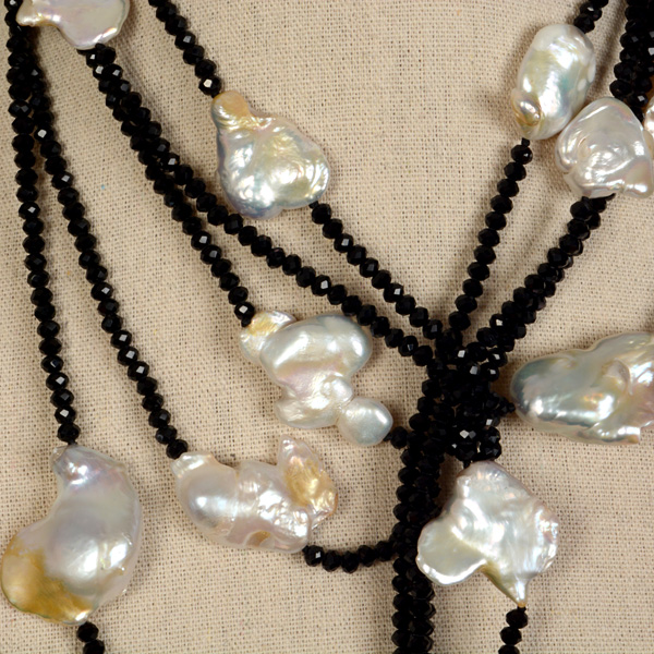Collar de bolas negras de cristal fecetadas y 15 perlas barrocas naturales de agua dulce con tamaños de las perlas de 16 a 32 mm.