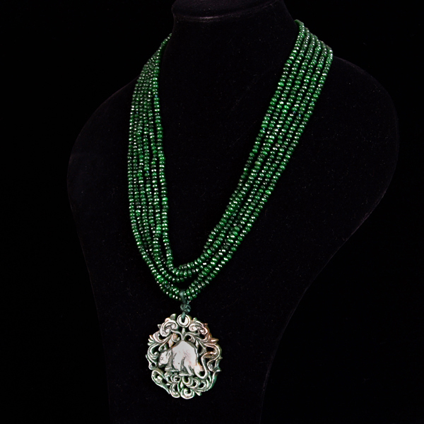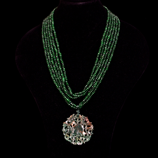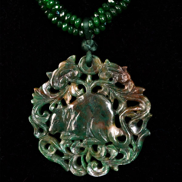 Collar de bolas de ágatas de tamaño 3 mm en color verde y una pieza de jade tallado de tamaño 65 mm en tonalidades verdes.