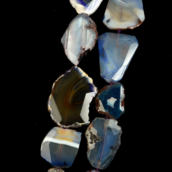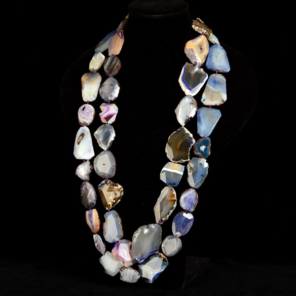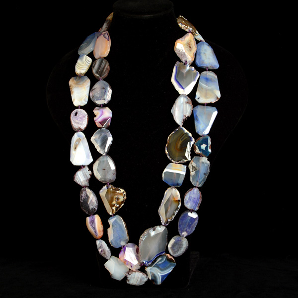 Composición de dos collares de ágatas de tamaños de 24 a 60 mm en distintas tonalidades de azules, violetas y tabacos.