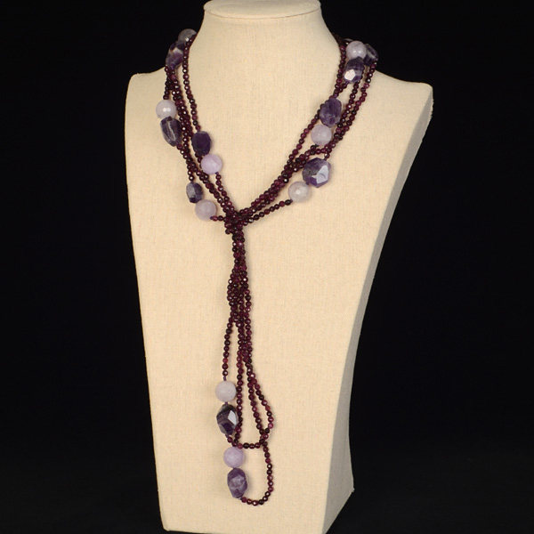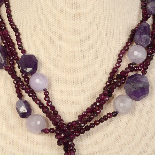 Collar de ágatas violetas con 10 bolas facetadas de tamaño 9 mm y 10 ágatas de formas irregulares en distintas tonalidades de de morado y tamaños de 13 a 21 mm.